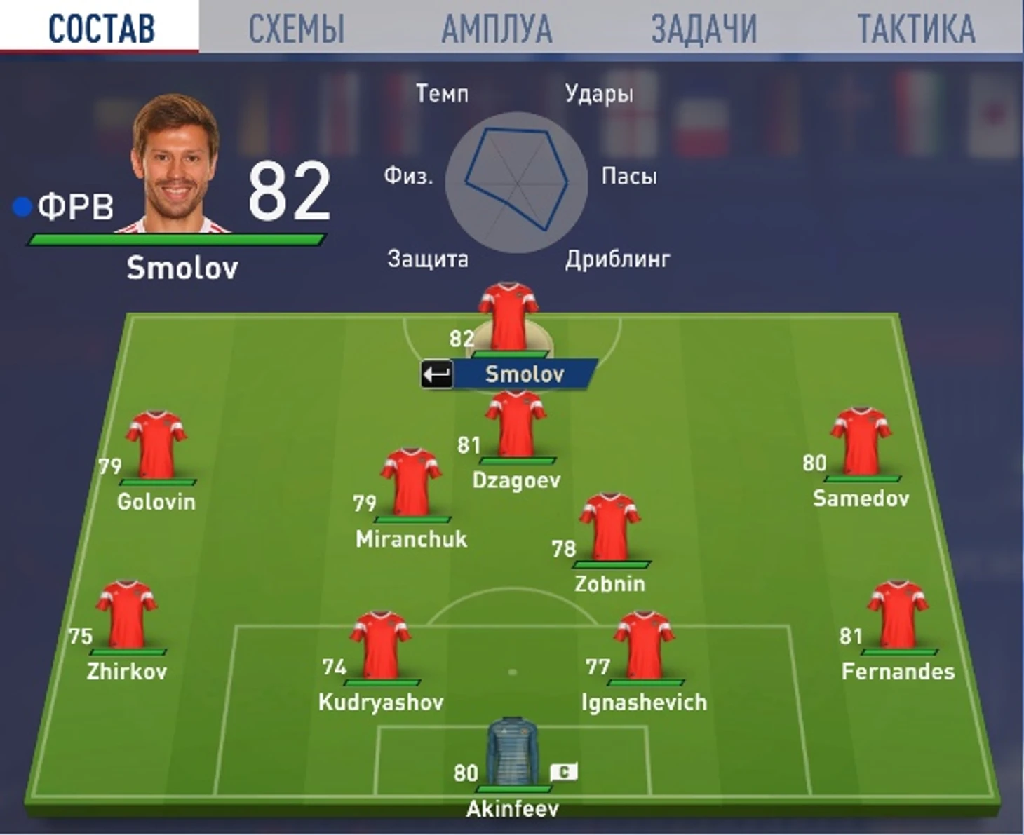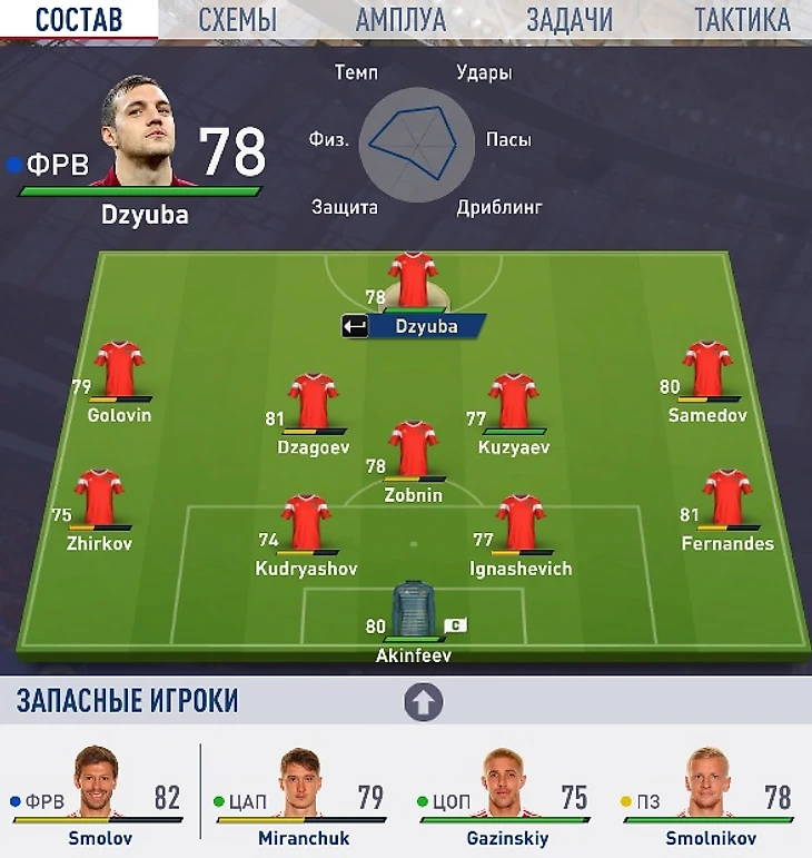 Запас и резерв, как вы поняли, пока не трогал. Возможно, если буду проигрывать, выпущу нападающего-столба Дзюбу.