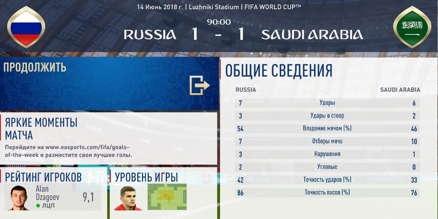 Достал козырь из рукава - Дзюбу. Именно такой игрок мне был нужен на концовку. И убрал Миранчука, немного видоизменив схему. Все шло своим чередом и ничего не предвещало беды. Похоже, раньше времени поверили в себя игроки и на секунду расслабился я. На 85 минуте капитан саудитов получил пас из центра поля, легко убежал от Игнашевича и перебросил выбегающего навстречу Акинфеева. Мне ничего не оставалось как бежать в атаку. Последние минуты арабы плотно осели у своих ворот и не дали ничего создать. Обидная ничья, которая сравнима с поражением. Статистика все же была на моей стороне. Я получил удовольствие от игры сборной во втором тайме до 85 минуты. В таких матчах нужно ни на секунду не выключаться из игры. Со стартовым составом я угадал. На мой взгляд, никто не выпадал из игры. Ну, и снова лучший игрок в составе сборной - это Алан Дзагоев.
