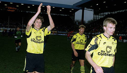 Поульсен радуется вместе с другими дортмундцами победе над Баварией в Мюнхене в 1991 году. Тогда она была последней в истории клуба. До сегодняшнего сезона…