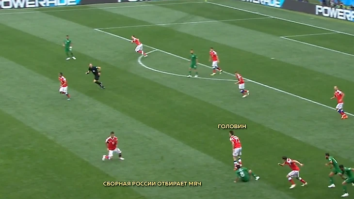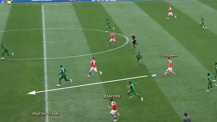 1. Головин получает мяч на своей половине поля и сразу разгоняет атаку.