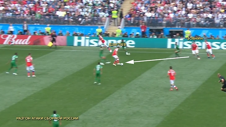 2. Он проходит с мячом и делает проникающую передачу в штрафную площадь Дзагоеву.