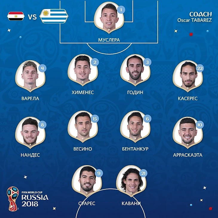 Состав сборной Уругвая был наполнен звездными игроками во всех линиях. Имея в атаке серьёзную связку в лице Суареса и Кавани, южно-америкацы распологали хорошими шансами против не самой сильной обороны сборной Египта. А игроки центральной линии уругвайской сборной Бентанкур и Весино должны были грамотно доставлять мяч до нападающих.