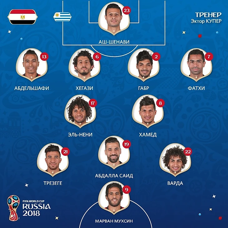 Состав же африканской команды не мог похвастаться обилием звезд( Ключевой игрок Моххамед Салах продолжал востанавливаться о травмы) имея только сильных игроков в средней линии. И в основном команда должна была строго играть в обороне и пытаться что-то создать в контратаках при поключении Эль-Нени и Хамеда.