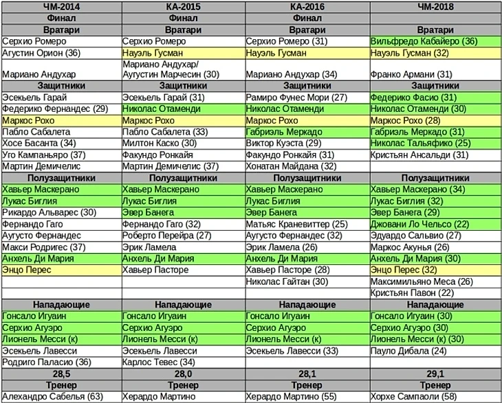 Легенда: зелёный - игроки основного состава; жёлтый - игроки, участвовавшие в больших турнирах ранее; белый - те, кто играл ранее, но не вызваны теперь, а для графы ЧМ-2018 - новички крупных турниров. В скобках указан возраст футболистов на момент начала ЧМ-2018, в предпоследней строке - средний возраст игроков в заявке.