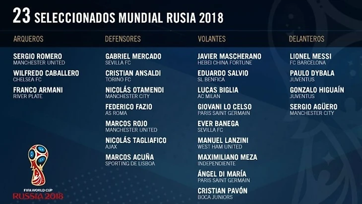 * в итоговый список по причине травм игроков внесены изменения: Науэль Гусман вызван вместо Серхио Ромеро, Энцо Перес - вместо Мануэля Лансини
