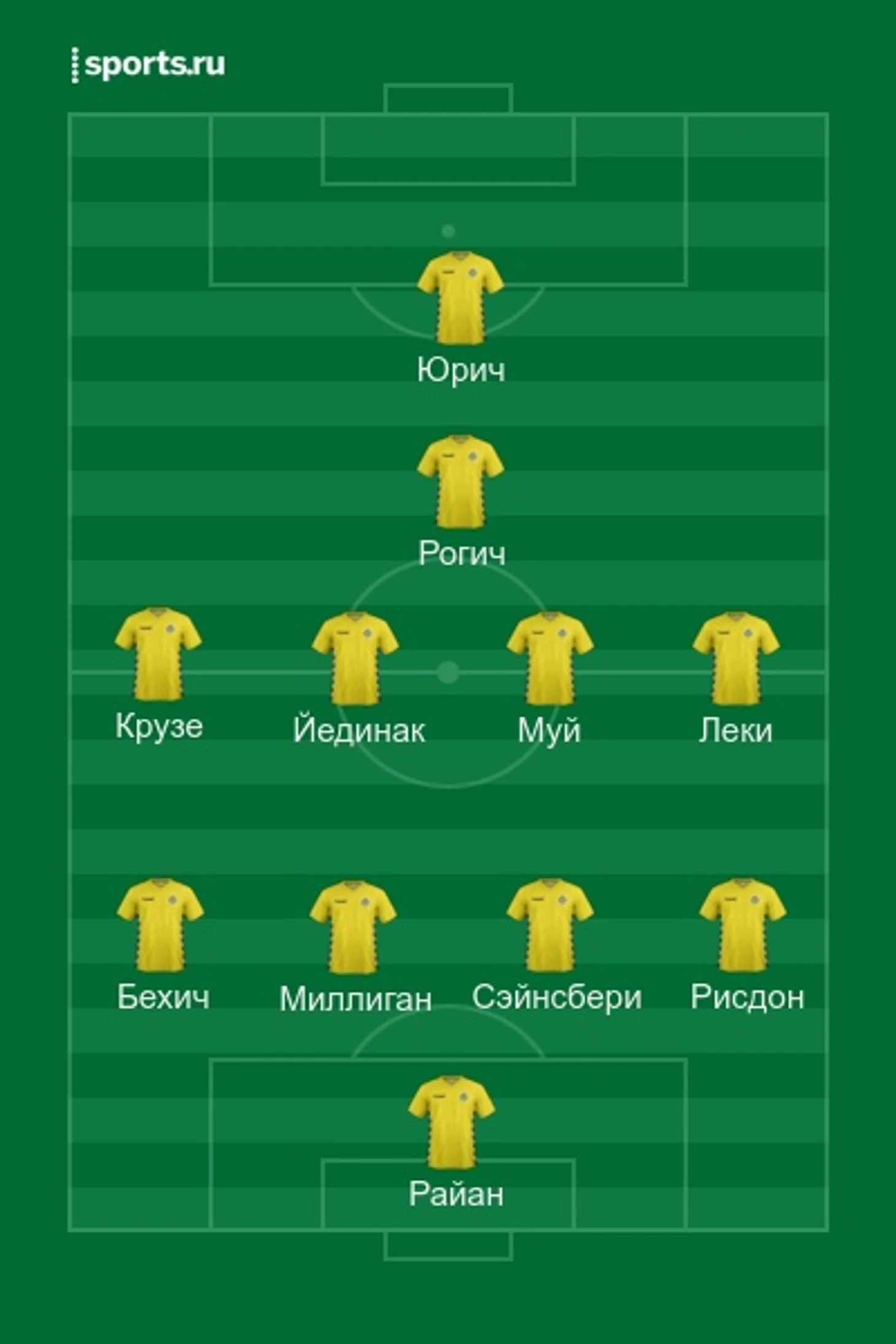 Полузащитники. Схема сборной Австралии обычно переходит из 4-2-3-1 в 4-4-1-1 и обратно, в зависимости от оппонента, причём без необходимости каких-либо кадровых изменений. Сложно представить себе центр поля австралийцев без своего капитана Майкла Йединака (он предпочитает, когда его называют Майл). Да, кстати, капитан именно Йединак, а не Тим Кэйхилл. Единак, являющийся отличным разрушителем, провёл не самый удачный сезон за «Астон Виллу», но вряд ли это послужит поводом оставить его вне состава. Рядом с Единаком нужен полузащитник, способный как разрушать, так и заниматься продвижением мяча. Пожалуй, единственной такой опцией является представитель «Хаддерсфилда» Аарон Муй, так как и Массимо Луонго, и Джексон Ирвайн также являются игроками оборонительного плана. Эти двое должны получить своё игровое время, особенно в том случае, если сборная Австралии будет вести в счёте и постарается играть на удержание.