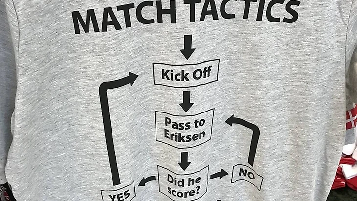 Многие скептически относятся к атакующей игре сборной Дании, говоря о том, что команда поделена в этом плане на Эриксена и всех остальных. Датчане, кстати, относятся к этим разговором с юмором, в магазинах даже появились такие вот майки:
