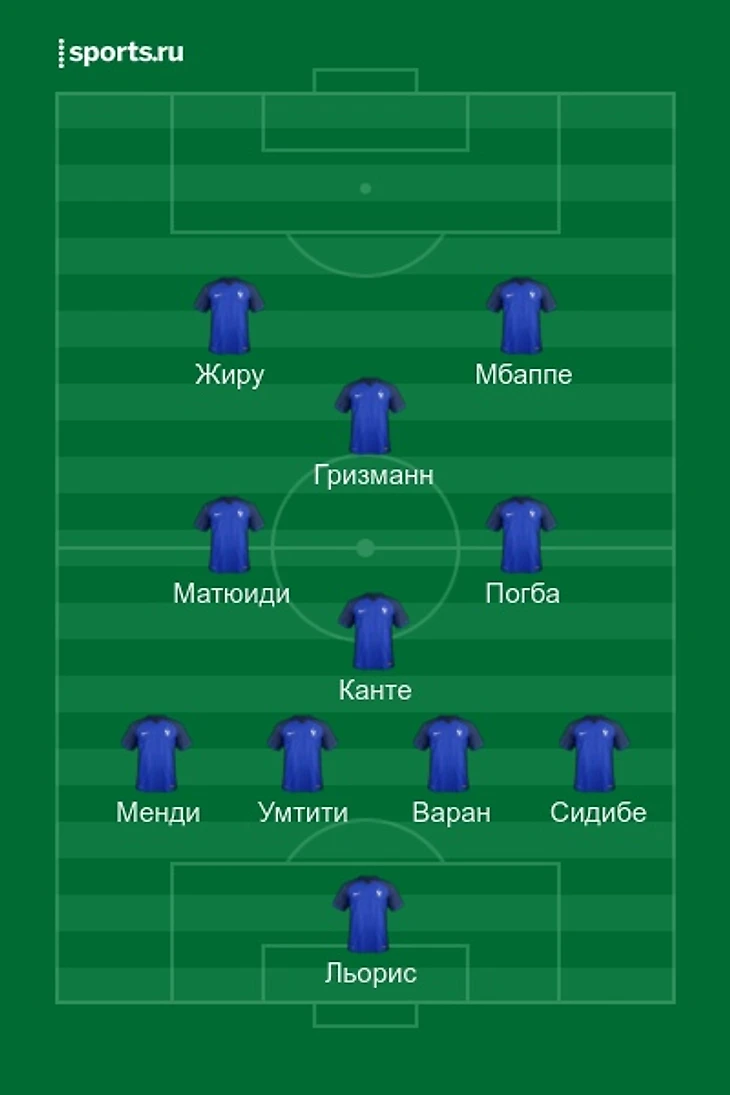 Расположение тройки атакующих игроков сборной Франции настолько условно, что выделить конкретную схему не представляется возможным. Это может быть 4-3-1-2 с Гризманном или Фекиром в оттяжке, может быть 4-3-3 с Жиру или Гриззманом в центре и флангами в лице Мбаппе/Лемара/Дембеле/Товена, может быть 4-3-2-1 с Жиру на острие и парой Фекир-Гризманн под ним. Вариантов множество, но я всё же остановился бы на схеме 4-3-1-2 с Гриззманом, Жиру и Мбаппе в старте.