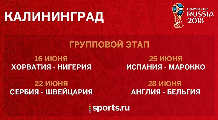 Калининграду предстоит принять 4 матча группового этапа, первый состоится уже сегодня в 23:00 по московскому времени – Хорватия – Нигерия. Также Калининград увидит противостояния сборных Сербии, Испании, Англии, Бельгии, Швейцарии и Марокко.
