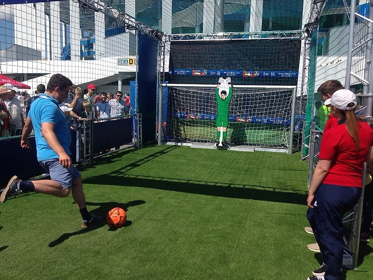 Около стадиона организованы развлекательные площадки: схожие с теми, что есть и в фанзоне. Вот кореец со шведом играют в текбол – смесь настольного тенниса и футбола, а вот – тянется очередь из желающих пробить по воротам «робокипера» (вратаря, реагирующего на удар благодаря специальным датчикам). Большинство ударов голкипер отражает, но не мои – я забил 3 гола из 3 ударов.