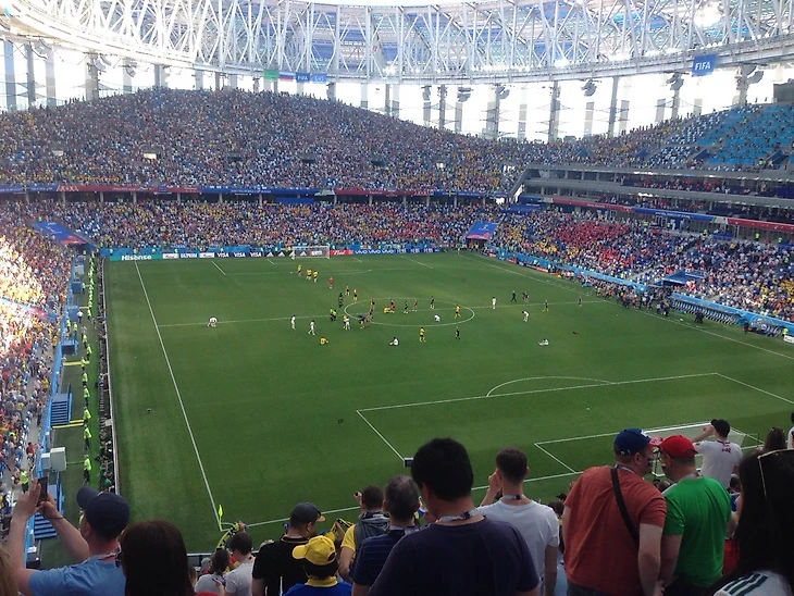 В день матча на улицах становится видно корейцев. Они одеты в красные футболки, некоторые – в традиционные костюмы. Также с корейскими флагами прогуливаются молодые русские девушки – вероятно, они являются поклонницами корейских сериалов. Шведы же в это время большой колонной направляются на стадион: кто на метро, кто на автобусах. Интересуюсь у шведов, как они оценивают свою сборную. Отвечают, что команда хорошая, а без Златана она стала ещё лучше.