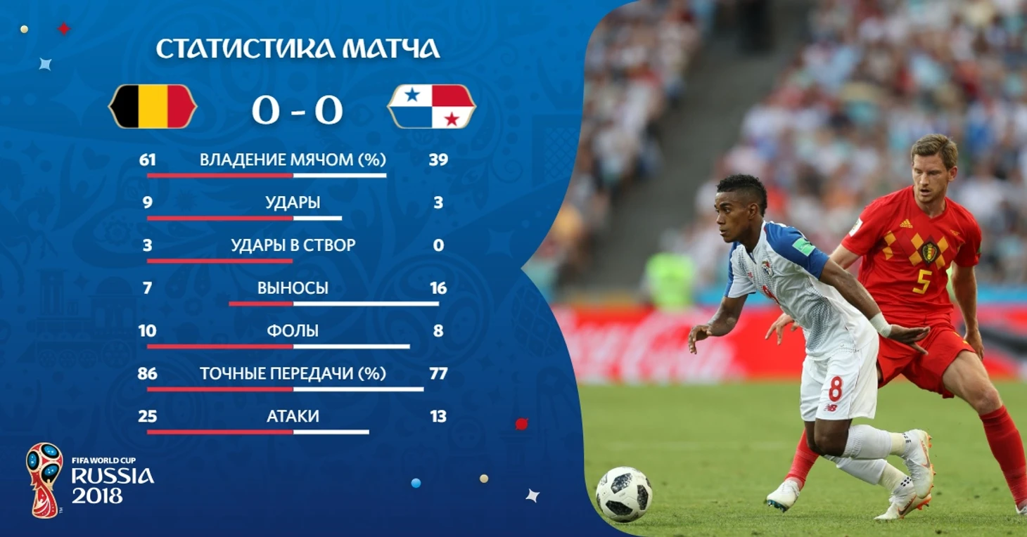 Понимая, что большую часть матча панамцам придется обороняться, они всей командой находились на своей половине. Бельгийцы же привыкли играть с мячем и уверенно себя чувствовали, проведя более поолвины времени на чужой стороне. Но 25 атак, 4 из которых закончились ударом в створ так и не привели к открытию счета. И бельгийцы немного удрученные отправились на перерыв, где обязательно должны были услышать наставления тренера по поводу того как надо завершать моменты.