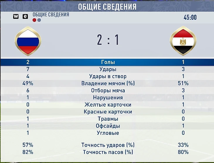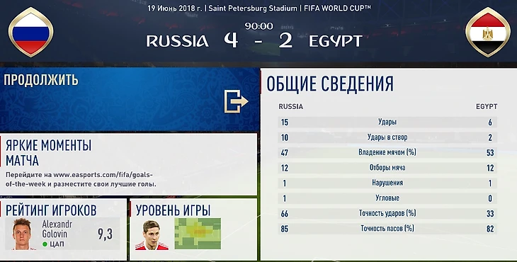 Матч выдался очень упорным, но благодаря правильно выбранной тактике удалось обыграть египтян. Сразу два мяча были забиты в контратаке, где медлительные защитники Египта ничего не могли противопоставить. Лучший игрок в составе сборной - Александр Головин. Что в жизни, что в виртуальном футболе.