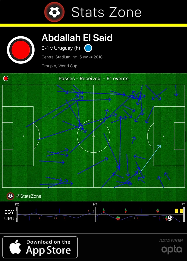 Два месяца в Финляндии с игрой на непривычной позиции не повлияли на статус Эль-Саида в сборной. В игре с Уругваем он привычно вышел под единственным нападающим – Мохсеном. Он стал лучшим игроком матча по числу передач в финальную треть (38, 71% точности), и лучшим у Египта – по количеству принятых передач (51, у Эль-Ненни – 39). Абдалла проиграл почти все единоборства в атаке (6 из 7), но похожая статистика – у всех египтян.