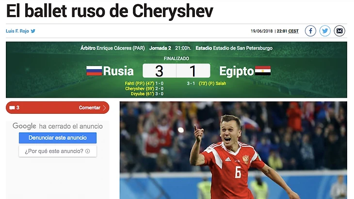 "Россия начала этот чемпиона мира, имея много проблем. Никто и не думал называть команду одним из фаворитов турнира. Но две победы разбудили мечту всей страны. Кажется, сборная готова выдвинуть и свою кандидатуру. России хватило 15 минут, чтобы разбить надежды египтян, которые особенно и не угрожали чужим воротам. Даже удача была не на стороне Египта. Все началось с автогола. А потом были десять минут натурального русского балета. Кульминацией стал гол Черышева, который сравнялся с лучшим бомбардиром турнира Криштиану Роналду. Россия на протяжении всей игры показывала, что она единая команда. Играла быстрее, рискованнее, сразу несколько футболистов могли создать опасные моменты. Сначала Черышев, потом Головин, затем неутомимый Дзюба, который постоянно боролся с защитой египтян и забил выдающийся гол после индивидуальных действий", – пишет испанская газета Marca.
