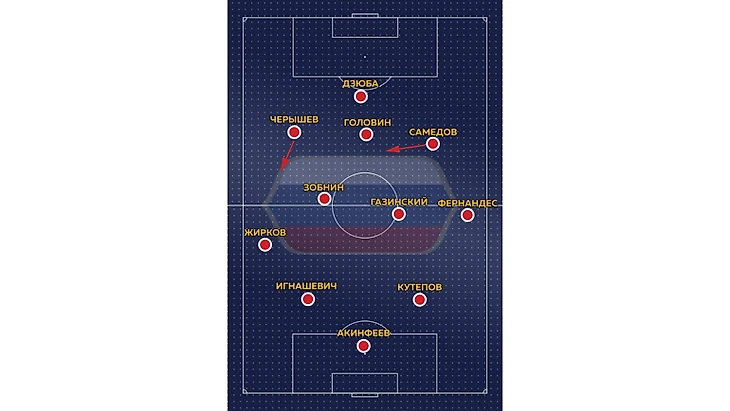 Против Саудовской Аравии акцент был сделан на прессинг и быструю доставку мяча в штрафную площадь. У арабов, мягко говоря, хромает организация игры в обороне, и надо было грамотно использовать свободные коридоры. У Египта с обороной все в порядке и коридоров никаких нет, а значит, проламывать его защиту быстрыми атаками через центр было бессмысленно. Новый план включал в себя огромное количество навесов на Дзюбу и более широкий фронт за счет подключений Фернандеса. Но кое в чем наши просчитались.