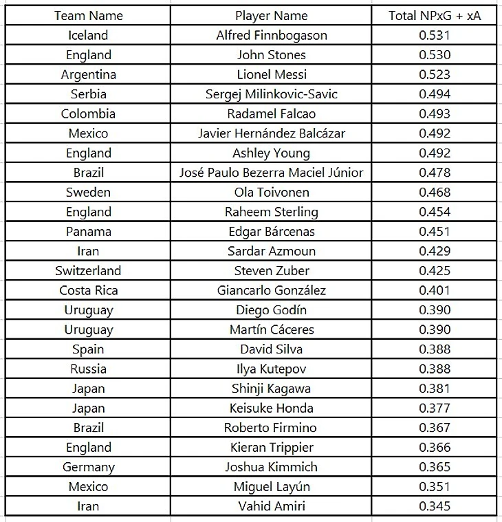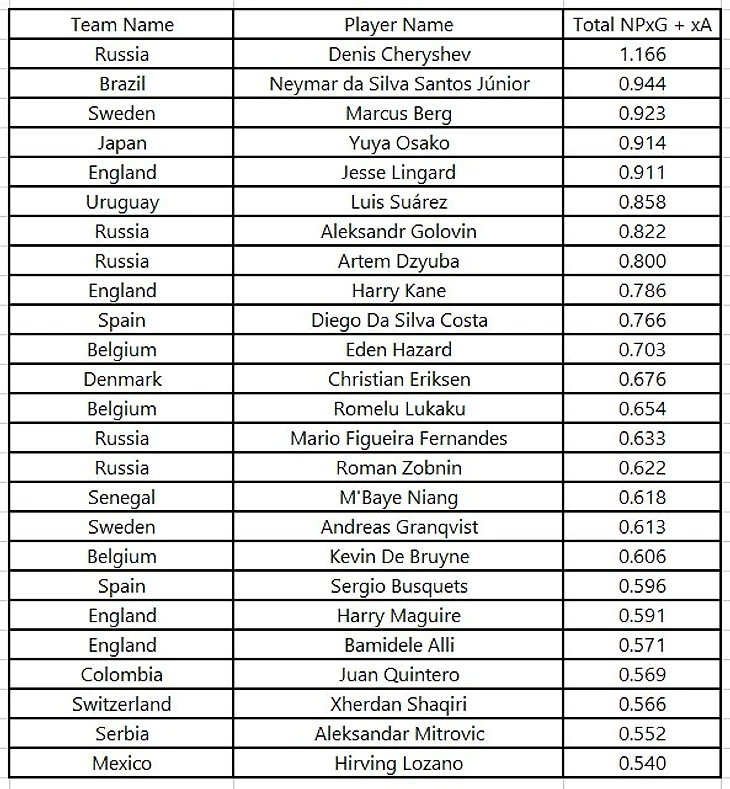 Лучшие игроки ЧМ 2018 по NPxG+xA (качество ударов без учета пенальти + качество передач под удар) на данный момент.