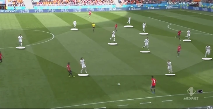 Выглядит примерно так: Уругвай здорово покрывает поле в схеме 4-4-2 и без ошибок смещается в зависимости от положения мяча. По перемещениям в таком блоке им мало равных на турнире.