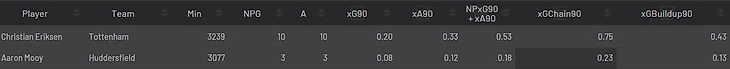 Вот сравнение двух лидеров. Числа разительно отличаются, но и уровень команд тоже. Хотя влияние на игру схожее, Эриксен провел 37 из 38 матчей в АПЛ в текущем сезоне, Муй 36. Эриксен создает 22% от общекомандного xA, Муй 17%.