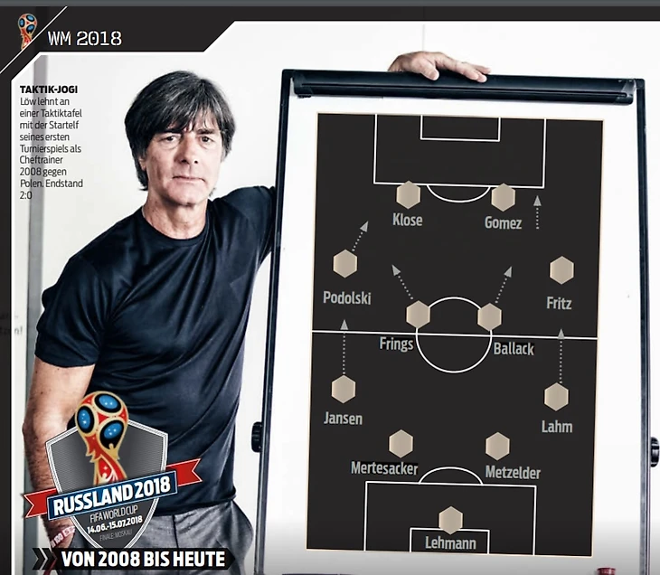 Йоахим Лёв о 4-2-3-1 в 1/8 финала против Англии (4:1): «В 2010 году Баллак получил травму. У нас была невероятно молодая команда с маленьким опытом: это был первый турнир для Нойера, Боатенга, Хедиры, Мюллера или Озила. Тогда перед нами стояла задача быстро выходить из компактной обороны и быстро контратаковать с помощью Мюллера, Озила и Подольски. Также к атакам часто подключался Филипп Лам, а в центре у нас был завершающий атаки Клозе. Однако общий стиль игры был компактным. Самое важное: как мы можем хорошо располагаться на поле и быстро переключаться в игре? Этот вопрос был актуальным в течение всего турнира, в этом было предназначение этой команды. В том числе и потому, что в центре у нас была хорошая организация благодаря Швайнштайгеру и Хедире. Однако эта команда еще не была готова самостоятельно формировать игру.