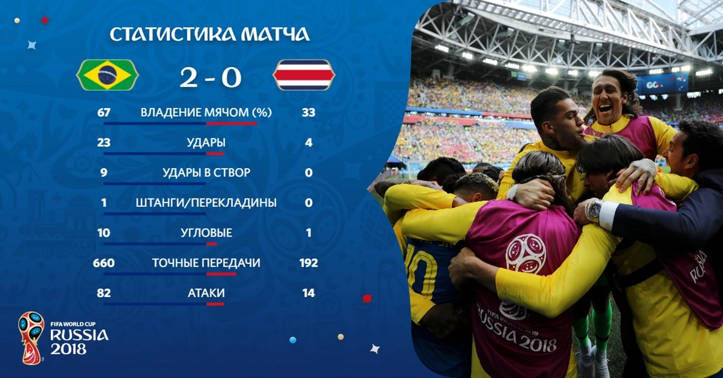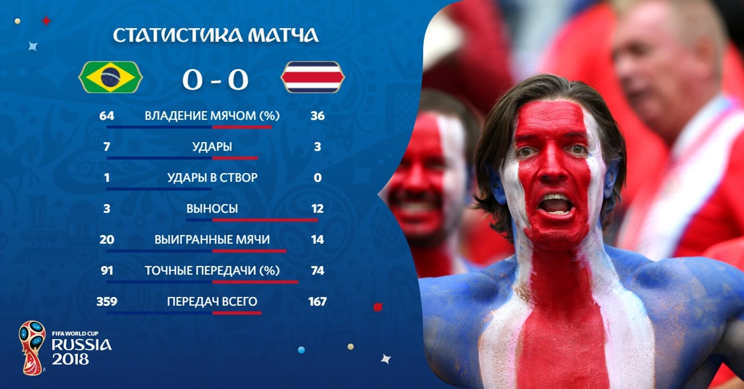 9 день мундиаля стартовал матчем между сборными Бразилии и Коста-Рики. Бразильцы неудачно начали турнир с ничьей в игре со швейцарцами. В той встрече у пятикратных очень многое не получалось именно в атаке. И гол, который они пропустили после нарушения правил не удалось отыграть. После такого исхода победа команда была нужна как никогда, болельщикам очень трудно воспринимать неудачи своей сборной. Даже 4 место на домашнем турнире было настоящей катастрофой для всей страны. Представители северо-американской конфедерации, удивившие своей игрой 4 года назад, непременно хотели повторить сотворенное ранее. Но поражение в 1 туре от сборной Сербии уменьшила шансы на удачный исход.