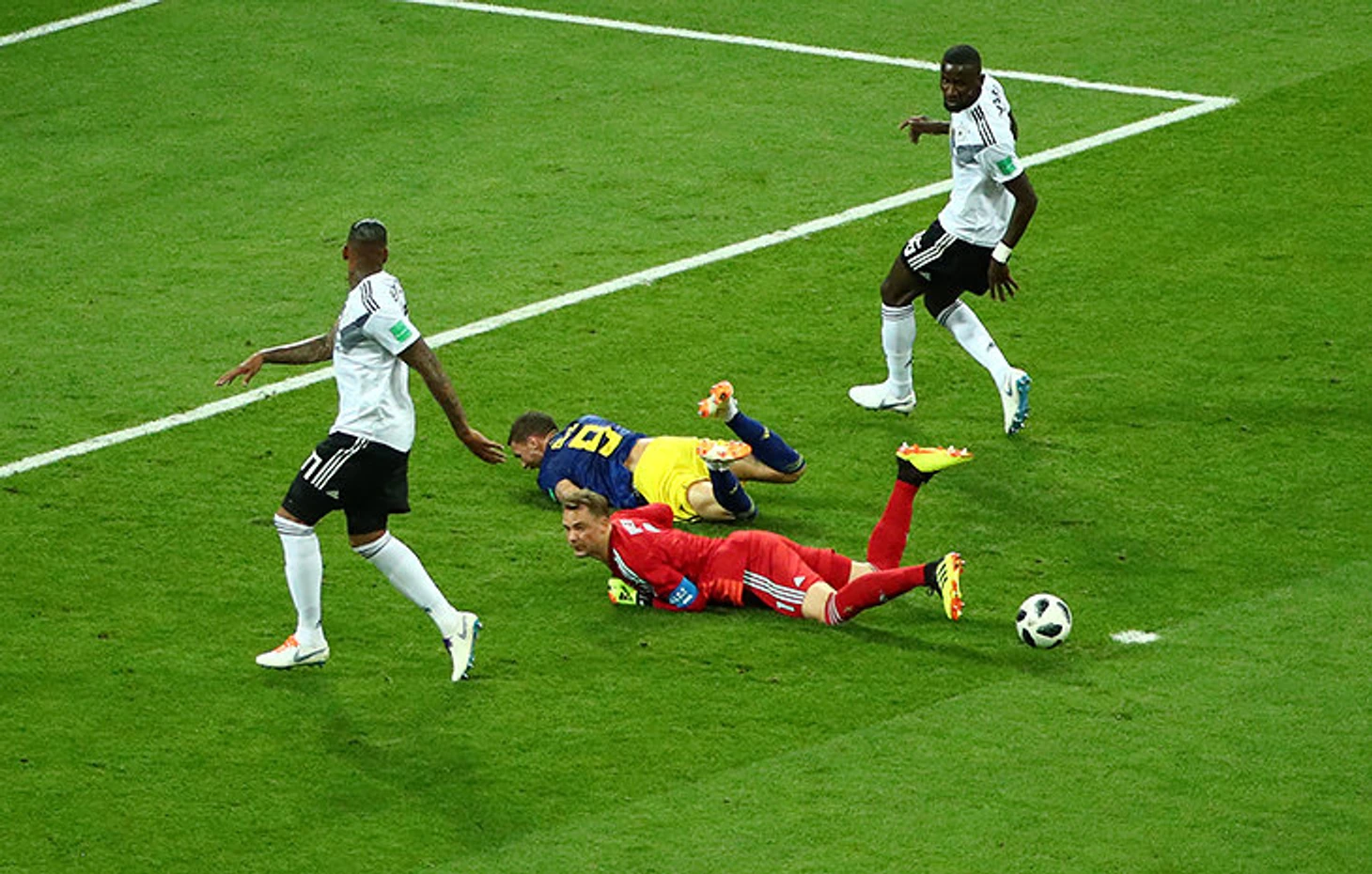 На 12-й минуте матча Германия – Швеция нападающего шведов Маркуса Берга сбил в штрафной Джером Боатенг. Это видели все, кроме главного арбитра Шимона Марчиняка, который не только не свистнул нарушение сразу, но и не стал пользоваться видеопросмотром.