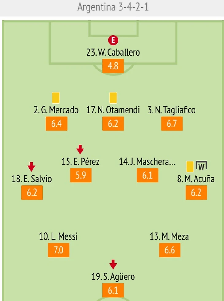 Хорхе Сампаоли внес 3 кадровых изменения в стартовый состав: Меркадо, Перез и Акуна появились на поле с первых минут вместо Рохо, Биглии и Ди Марии. На первый взгляд, такие рокировки кажутся вполне обоснованными. Ди Мария матч с Исландией откровенно провалил и был заменен по ходу встречи, аналогичная ситуация и с Биглией. Выход Меркадо с первых минут выдавал намерение Сампаоли расположить 3 игроков в начальной фазе построения атак по схеме 1 - 2, с дальнейшим переходом Меркадо и Тальяфико в следующую линию и захватом преимущества над первой линией хорватской обороны (в матче с Нигерией она состояла из 2 человек).2. СХЕМА. Главное, что изменилось - схема. 3-4-3 вместо 4-3-2-1 - таков был план на игру Сампаоли.
