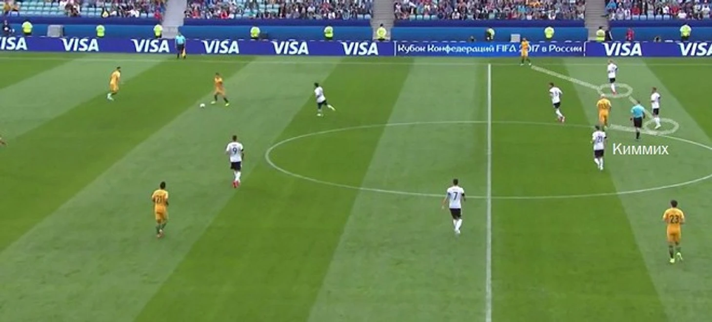 На Кубке конфедераций Лёв вовсю пользовался универсализмом Киммиха. На турнире Джошуа успел побыть правым латералем, правым центральным защитником и опорником, при этом совмещая по две роли одновременно. С Австралией Киммих играл по канонам Гвардиолы – когда Германия атаковала, смещался на фланг и помогал Брандту (схема немцев при этом превращалась в 4-2-3-1), а при обороне садился правым центральным защитником и караулил полуфланг, самую уязвимую зону в современном футболе. При этом Джошуа старался занимать максимально высокую позицию, чтобы сразу отобрать мяч и разогнать атаку, как на скриншоте ниже. Чтение игры Киммиха – на очень высоком уровне: немец сделал 12 перехватов в матчах группового турнира. И это при том, что Германия стремится много владеть мячом – при таком стиле игры неизбежно ухудшение статистики отборов и перехватов у оборонительных игроков.