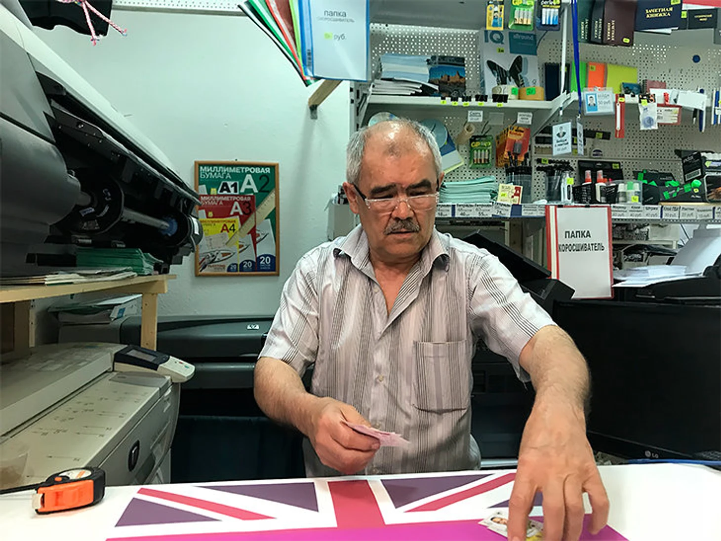 В салоне нас встретил опытный волшебник Николай – он делает с бумагой все что угодно. Прошивает курсовые и дипломы, колдует огромным дыроколом, проводит разные виды печати и склеивает книжки. В его владениях – десять принтеров и ксероксов разных размеров, два компьютера, полки с шариковыми ручками, замазкой и клеем. В комнате постоянно звонит черный кнопочный телефон – Николай попросил друга Романа купить картонки нужного размера, и тот отчитывался после каждого шага.