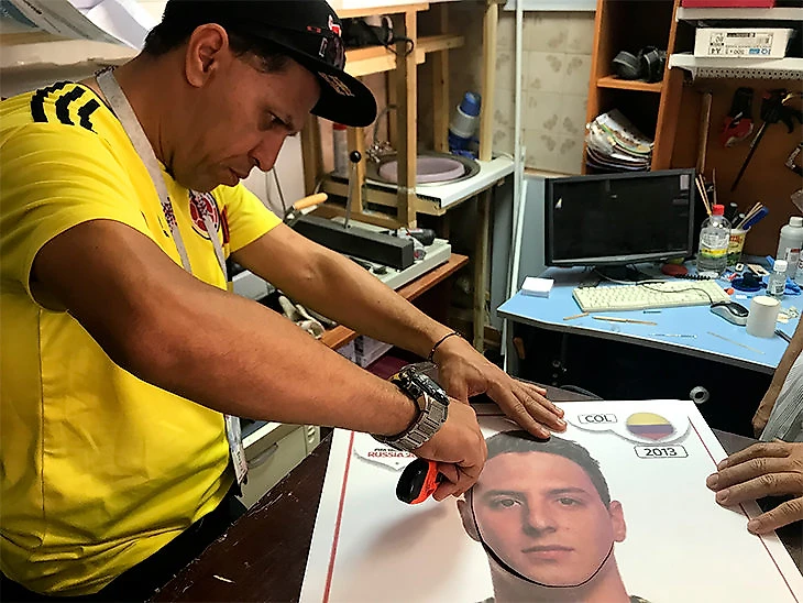 Утром в день матча против Польши мы с Хорхе пошли в копировальный салон за необычным заказом: увеличить карточки Panini примерно в 50 раз, распечатать, наложить на картонку, наклеить и проделать дырку в районе головы. Для карточек выбрали самых популярных игроков сборной Колумбии: Фалькао, Бакку, Хамеса, Агиляра, Морено, Санчеса и Оспину. Куадрадо не забыли – просто куда-то потерялась его карточка.