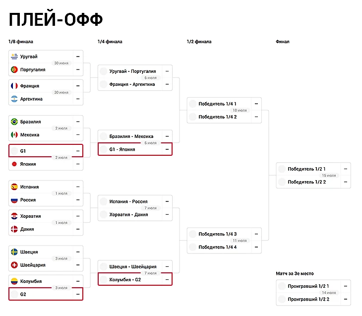 Победитель (G1) в 1/8 играет с Японией – почти мечта. Его соперник – с Колумбией, что принципиально сложнее. Зато в четвертьфинале он в случае победы в 1/8 получает победителя пары Швеция – Швейцария – на стадии 1/4 точно мечта.