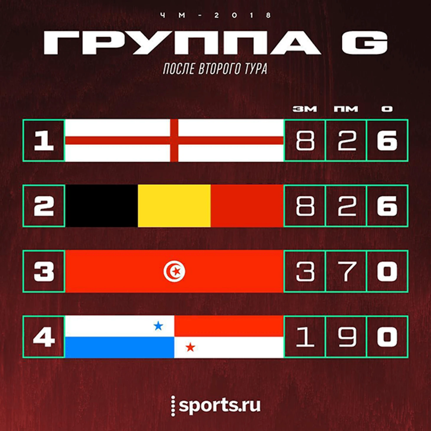 На выходных Англия и Бельгия синхронно разгромили слабых соперников, и теперь у команд абсолютно равные показатели: по 2 победы, 6 очков, по 8 забитых и 2 пропущенных мяча. У англичан на одну желтую меньше (2 против 3) – и поэтому сейчас они на первом месте.