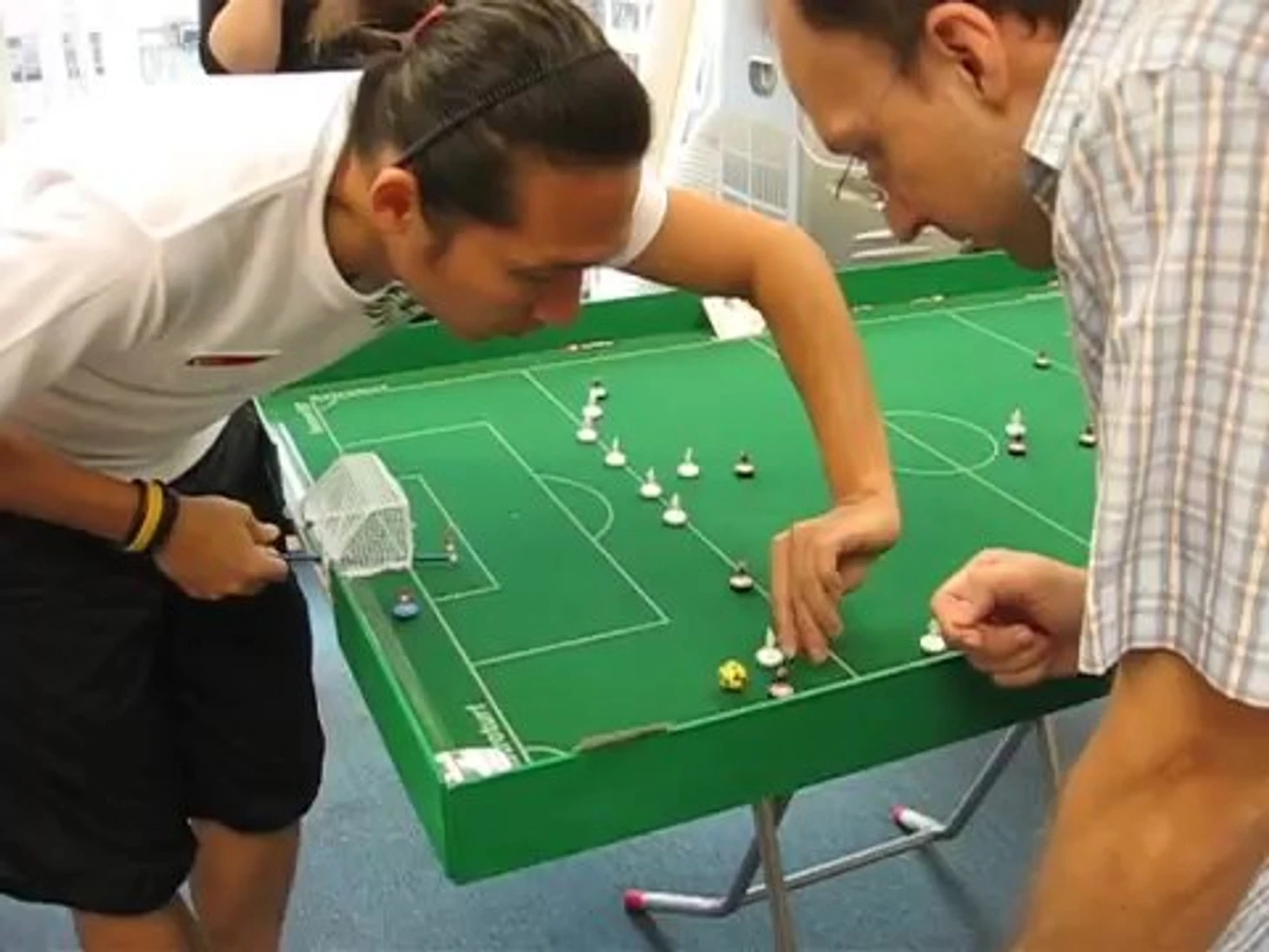 В дальнейшем, пивные пробки заменены на шашки игроков, вместо салфетки мяч с маленьким отскоком, а вратари имеют специальное крепление. Я знаю, что есть всякие варианты кикеров и настольных футболов, но у этой игры своя изюминка. Видимо, пока не напьетесь в баре с другом и не сыграете — не поймете)