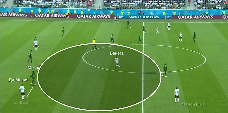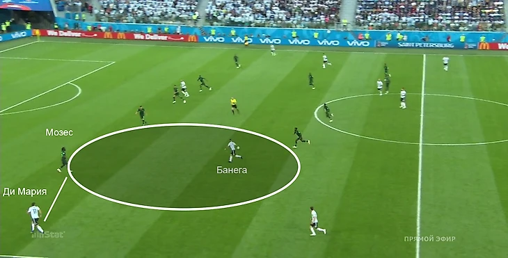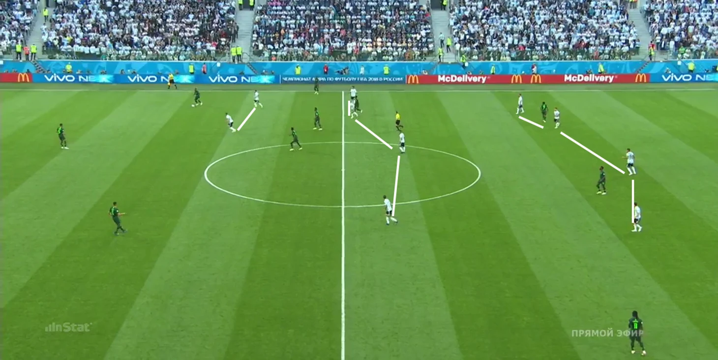 Аргентина точно не выглядела командой без тренера. Не было ни кучи дальних ударов, ни хаотичного движения. Были видны конкретные, пускай несработавшие на 100% идеи. Например, Анхель Ди Мария очень дисциплинированно и здорово держал широкую позицию на левом фланге, уводя за собой Виктора Мозеса. Это поддерживалось движением Игуаина и создавало пространство в опорной зоне Нигерии. Вот пример его использования Николасом Тальяфико в начале матча.