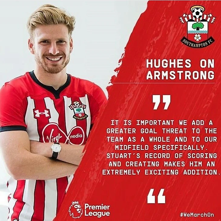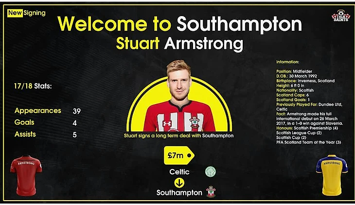 В это межсезонье было много разговоров о Куинси Промесе и о Шакири, назывались большие ценники, однако наш первый трансфер оказался иным. Игрок сборной Шотландии Стюарт Армстронг последовал по протонной дороге из Селтика в Саутгемптон всего за 7 миллионов фунтов.