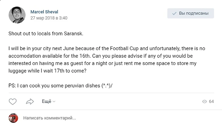 На тот момент я пользовался только одной соцсетью – «Вконтакте». Я отдавал себе отчёт, что скорее всего незначительное количество перуанцев, панамцев, колумбийцев и уж тем более иранцев с японцами зависает в этой соцсети. Но был удивлен когда обнаружил, что многие латиноамериканцы хотят найти друзей в России (как позже они объясняли ,это всё ради собственной безопасности). Почти все иностранцы состояли в группах, так или иначе относящихся к Чемпионату мира. И вот, совершенно случайно я зашёл на страничку молодого перуанского паренька ,который на всех фотографиях корчил разные рожи. И больше всего меня поразило, что на своей странице он разместил следующее: «Дорогие жители Саранска, 15 июня этого года я и мой друг будем в вашем городе. Если есть возможность, примите, пожалуйста нас в гости или хотя бы разрешите оставить у вас багаж. Я могу приготовить вам разные национальные перуанские блюда».