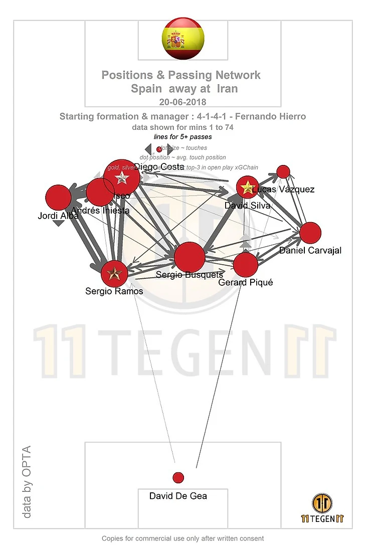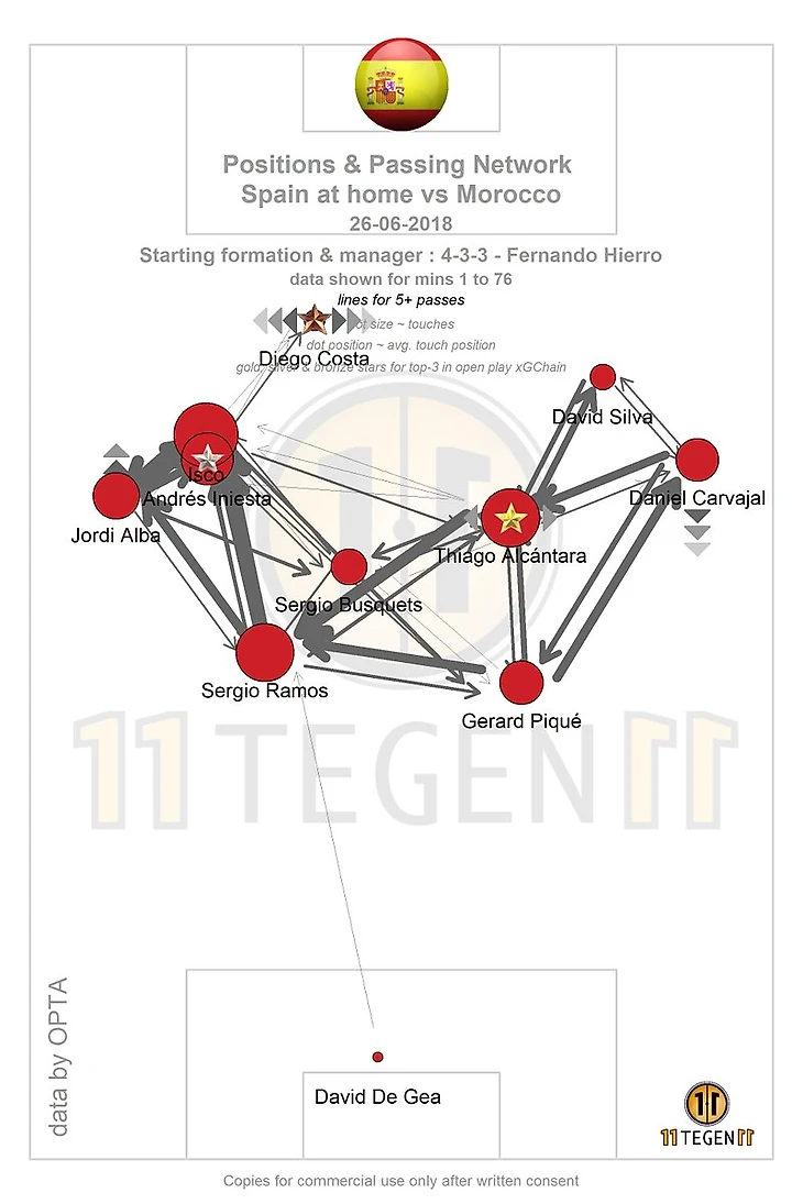 Да уж, Испания после групповой стадии оставила о себе двоякие воспоминания. Вроде как, не самая легкая группа, соперники не такие простые, как кажется, игру "Красная Фурия" показывала хорошую, но ошибки некоторых игроков не всегда позволяли добиваться желаемого результата. Тем не менее, основная цель - выход из группы с первого места, достигнута и одной из главных фигур в первых трех матчах был полузащитник Мадридского Реала - Иско. Играл он не на совсем привычной для себя позиции левого вингера, но в игру вступал чаще, чем кто-либо другой, посмотрите сами.