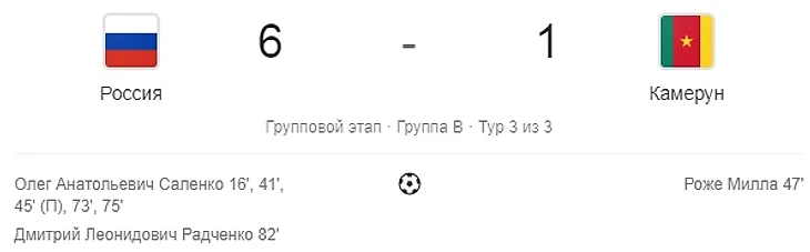 Многие помнят или слышали о легендарном матче сборной России на ЧМ-94 против Камеруна, в котором наша команда победила со счетом 6:1 и пять голов забил Олег Саленко. Но мало кто знает, что единственный гол в ворота россиян забил футболист в возрасте 42 лет. ВИДЕО
