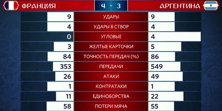 Хейтерам Аргентины, которые считают, что Франция была на голову сильнее, а у ее соперников не было никаких шансов, предлагаю взглянуть на статистику матча. Аргентина была не хуже Франции.