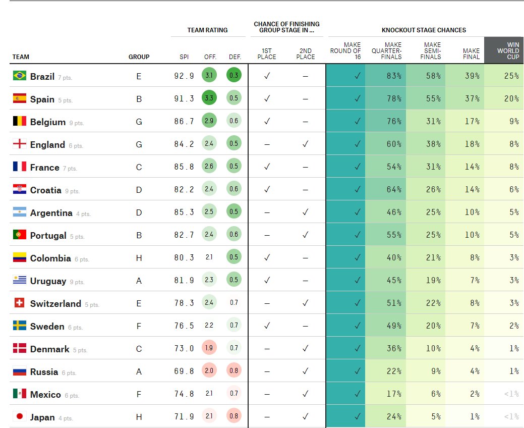 SPI (Soccer Power Index) – модель прогнозирования матчей ЧМ, основанная на качестве игры, прошлых результатах и качестве состава. Детальное описание – тут.