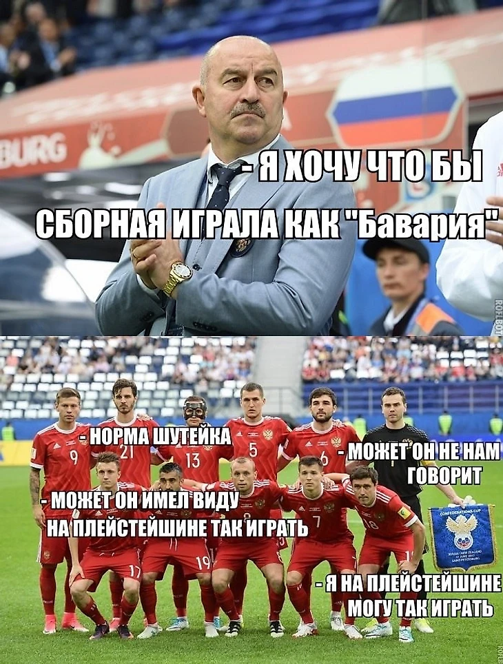 Мы снова забыли, что у нас есть команда и к домашнему чемпионату сомнений стало столько же, сколько у юных влюбленных перед первым сексом. Нам не нравилось, что после контрольных матчей Черчесов говорит, что все по плану, хотя по игре мы уступали даже Ирану. Не нравилась его напыщенность, самоуверенность и отсутствие Денисова. Апогеем стало 70-е место в рейтинге ФИФА (самое низкое из участников ЧМ), неликвидная игра с Турцией и безликий проигрыш Австрии. Дудь даже советовал игрокам забыть про установки тренера и сыграть как думают сами: за страну, болельщиков и друг друга. И многие с ним были согласны. На короткий отрезок времени в головах людей Черчесов встал в один ряд с Чубайсом, Гайдаром и Мавроди, а Интернет кишел примерно такими картинками.