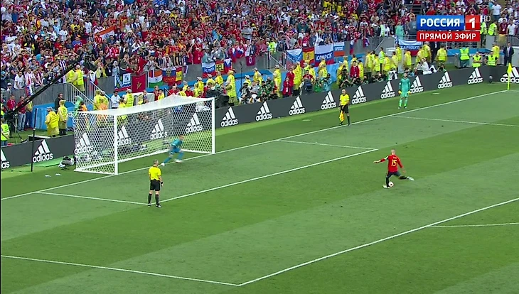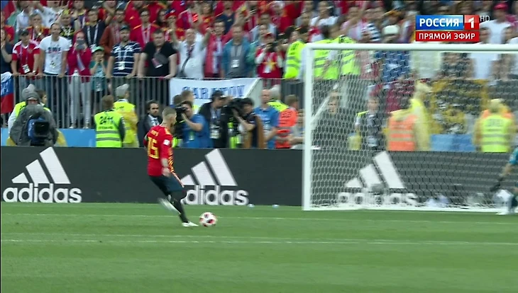 На скане видно, что в момент, когда Рамос занёс ногу для удара, Акинфеев уже приготовился прыгнуть в левый от себя угол. Всё же внимание Рамоса направлено на вратаря. Чтобы убедиться в этом, взглянем на этот момент с другого ракурса.