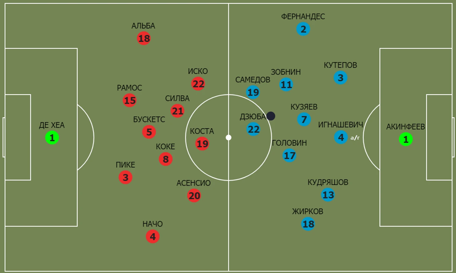 Все это были входы под острым углом, где линия последнего паса перекрывалась либо защитниками, либо Акинфеевым (в моменте с Костой). На этом созидательность Испании исчерпана.