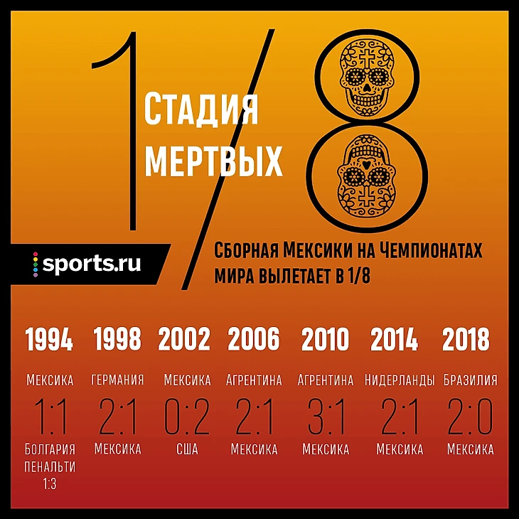 В Мексике уверены: 1/8 чемпионата мира проклята. На свете только две сборные, с 1994-го всегда выходившие в плей-офф ЧМ – Мексика и Бразилия. Но если бразильцы за это время выиграли два чемпионата мира, то мексиканцы сегодня в 7-й раз подряд проиграли первый же матч на вылет.