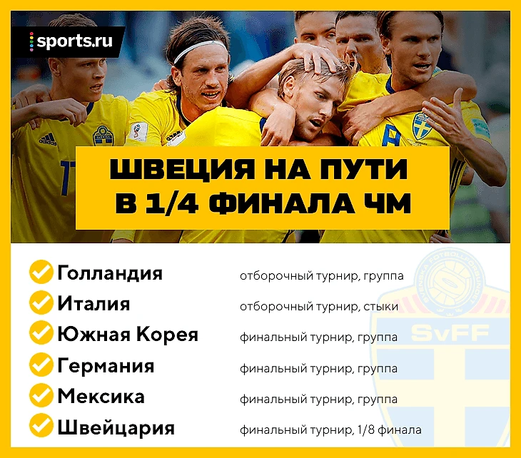 • Шведы пропустили два предыдущих ЧМ (не прошли отбор), могли не приехать и в Россию – им досталась очень сложная сетка: но они в группе обставили Голландию, а в стыках выбили Италию.