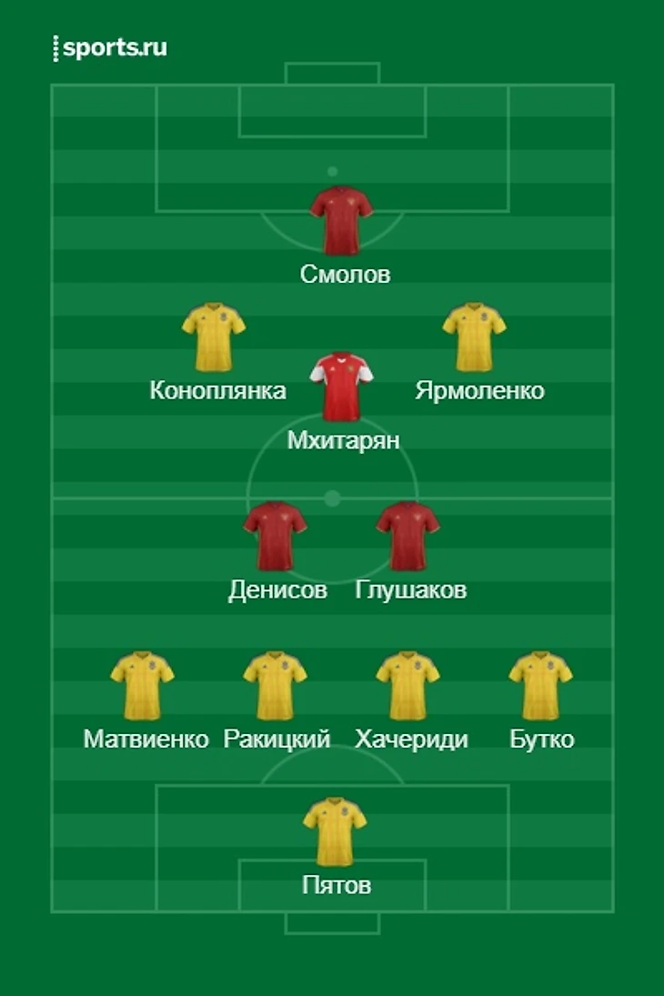 Пятов(Украина-Шахтер) - Матвиенко(Украина-Шахтер), Ракицкий(Украина-Шахтер), Хачериди(Украина-ПАОК), Бутко(Украина-Шахтер) - Денисов(Россия-Локомотив), Глушаков(Россия-Спартак), Коноплянка(Украина-Шальке-04), Мхитарян(Армения-Арсенал), Ярмоленко(Украина-Боруссия Дортмунд) - Смолов(Россия-Краснодар)
