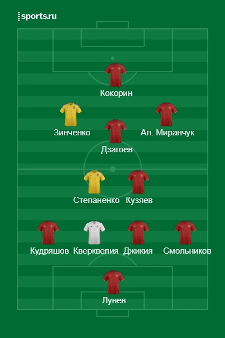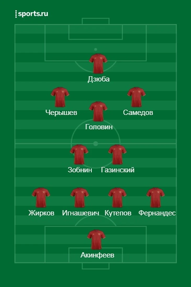 Акинфеев(Россия-ЦСКА) - Жирков(Россия-Зенит), Игнашевич(Россия-ЦСКА), Кутепов-Спартак), Фернандес(Россия-ЦСКА) - Газинский(Россия-Краснодар), Зобнин(Россия-Спартак), Черышев(Россия-Вильярреал), Головин(Россия-ЦСКА), Самедов(Россия-Спартак) - Дзюба(Россия-Арсенал Тула)
