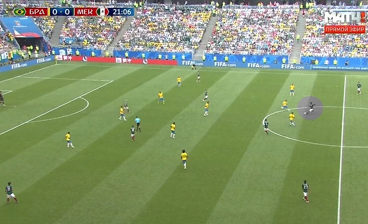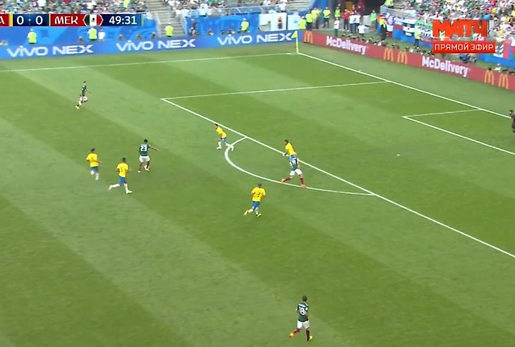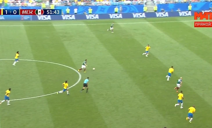 Казалось бы северо-американцы делали все правильно. Отлично действовали по всей ширине поля, быстро доставляя мяч на чужую половину с помощью длинных, часто диагональных, передач. Сыграть широко для Мексики было очень важно, ведь бразильцы в обороне действуют компактно, высоко располагая линию защиты. Опасности у ворот желто-синих должны были появиться при скоростных атаках. Пентакампеоны были максимально осторожны в первом тайме, поэтому мы наблюдали ряд полумоментов.