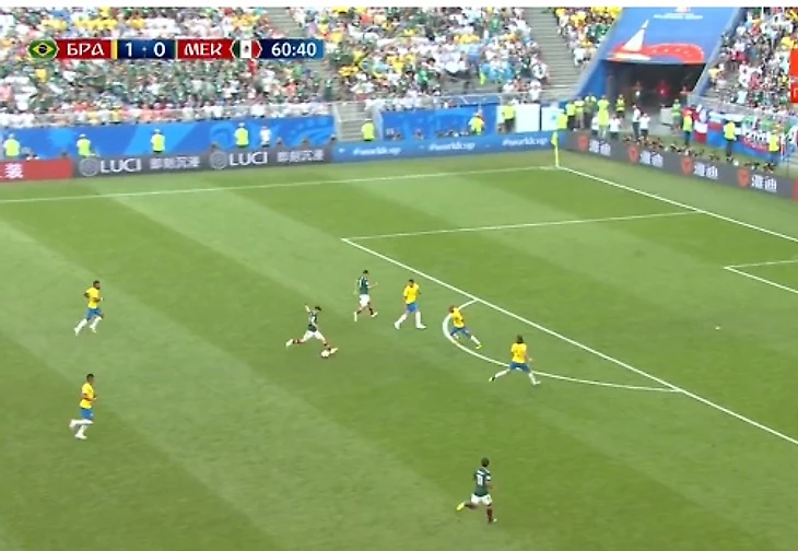 Вновь после перехвата подачи с углового у сборной Мексики появился шанс чтобы создать перспективную атаку, поймав высокую линию обороны Бразилии.