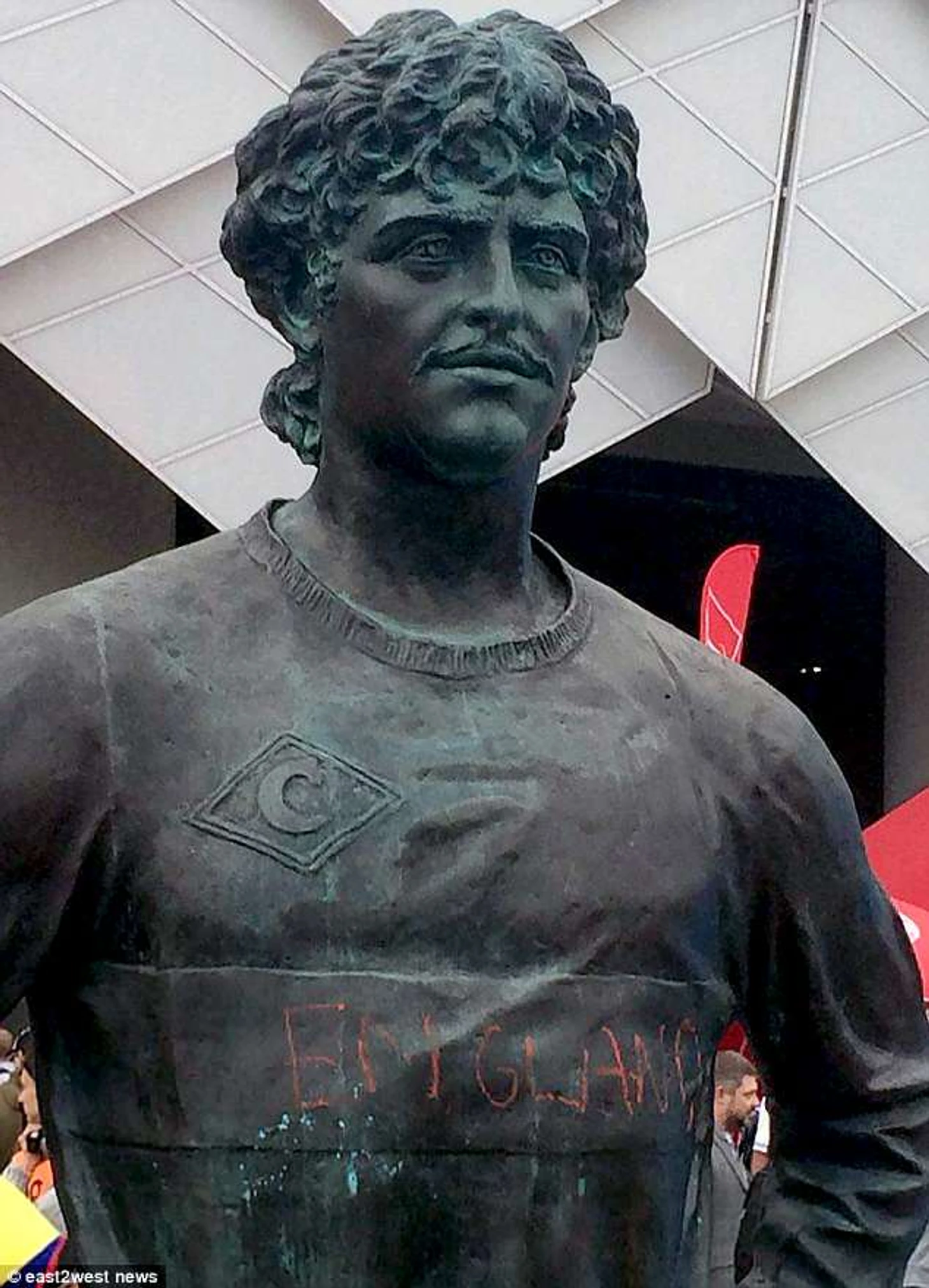 Болельщик по имени Руфус Холл красными буквами написал слово «England» на памятнике Федору Черенкову перед матчем английской сборной.